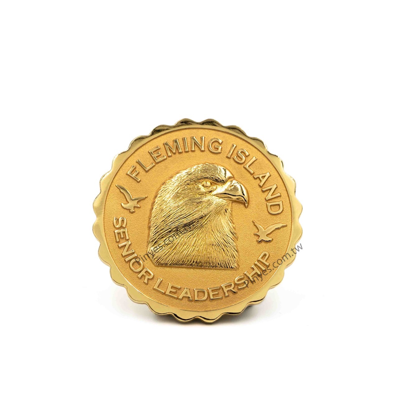 此款採全幣單色亮金電鍍,幣面不含任何琺瑯填色,整體視覺以金色為統一基調,層次感來自亮面與霧面的表面處理差異而非色彩對比。單色純金屬設計適合正式頒獎或機構識別用途,外觀較多色填色幣款更為內斂